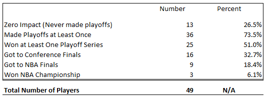 1 in 4 of the players studied (26.5%) were total busts in terms of their team impact. They never were a significant contributor on a playoff team; I call these guys zero-impact players. This includes obvious draft busts such as Darko Milicic and Adam Morrison, in addition to some guys you don't immediately think of, like Marcus Fizer, Mike Dunleavy Jr. and Jay Williams (sorry Jay, bad luck and/or stupidity don't get you off this list). This category also includes Kevin Love, who is obviously a great player, but hasn’t had much help thus far.