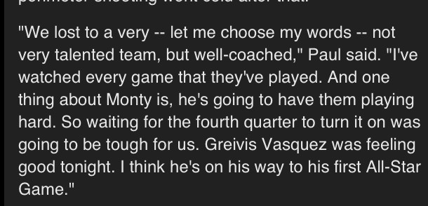 the actual Quote is: “They’re a team that people would say isn’t very talented, but they’re well coached. I watch them play every game, and one thing about Monty [Williams], is if you play for him you’re going to play hard. If you watch their games, they’ve been in overtimes and only had a couple of blowouts. Grievis Vasquez was feeling good tonight. I think he’s on the way to his first All-Star game. With them playing like that, we can’t wait until the fourth quarter to turn it on.”Quote:
