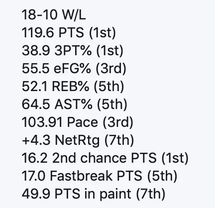 We love to use full season stats. That's a bit weird with this team since we have gone through so many stages and arena completely different team than the start of the season. These are the stats since our 13 game losing streak (from The Bird Writes).