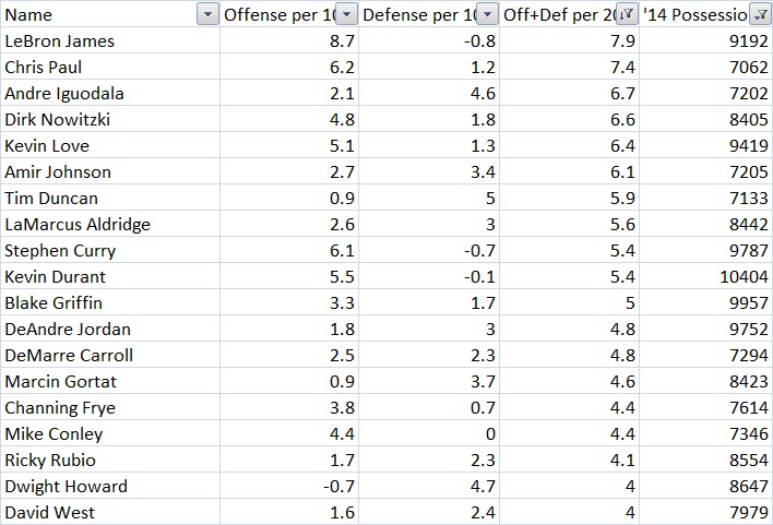 Player o-RAPM d-RAPM PER WS/48 James +8.7 -0.8 29.3 .264 Durant +5.5 -0.1 29.8 .295 Paul +6.2 +1.2 25.9 .270 Love +5.1 +1.3 26.9 .245